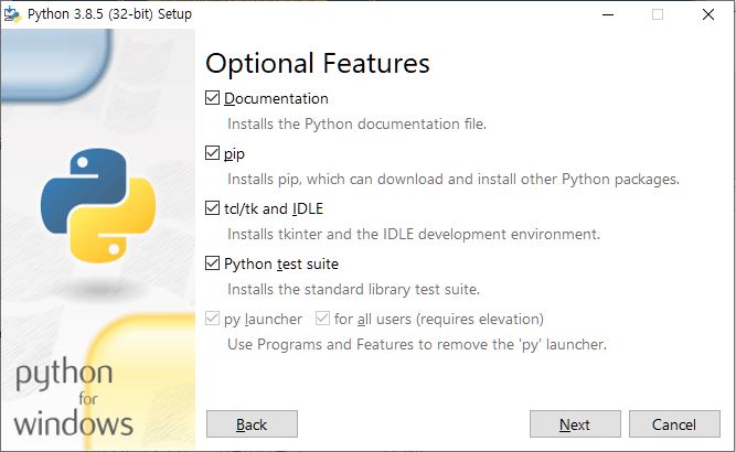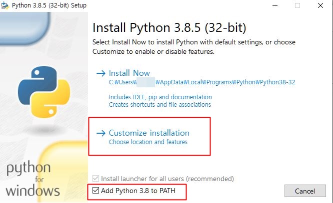 밑에 Add Python 3.8 to PATH가 기본적으로 체크되어 있지 않은데 체크해주는 정도면 신경쓰면 될 듯.